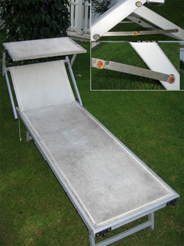Deutlich erkennbar die Verwendung minderwertiger Materialien: Die Liegefläche ist von Schimmel befallen und die Metalle (oben rechts) rosten schon nach kürzester Zeit!